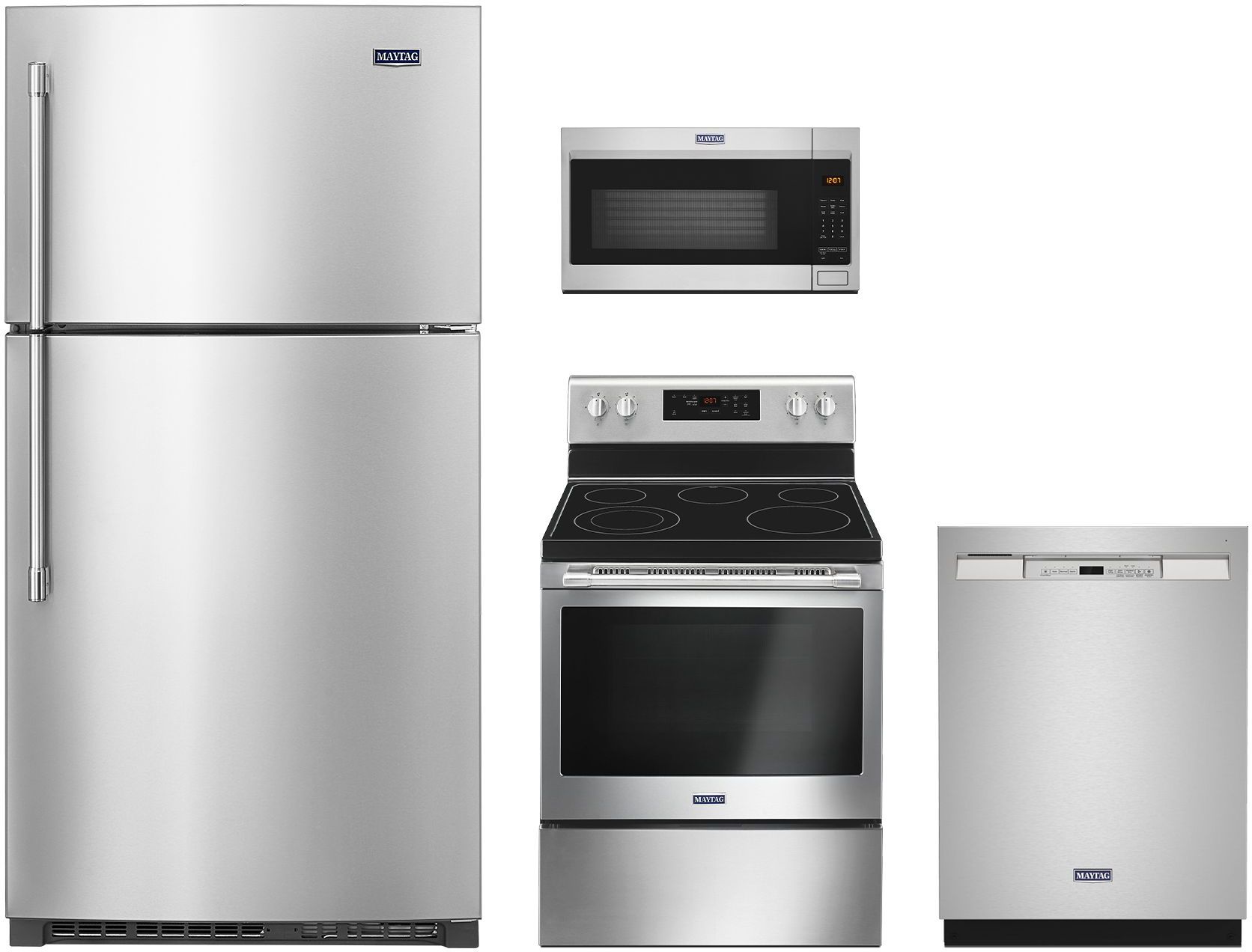 Maytag® 4 Piece Fingerprint Resistant Stainless Steel Kitchen Package with a top freezer refrigerator, over the range microwave, built in dishwasher and free standing electric range.Read More
